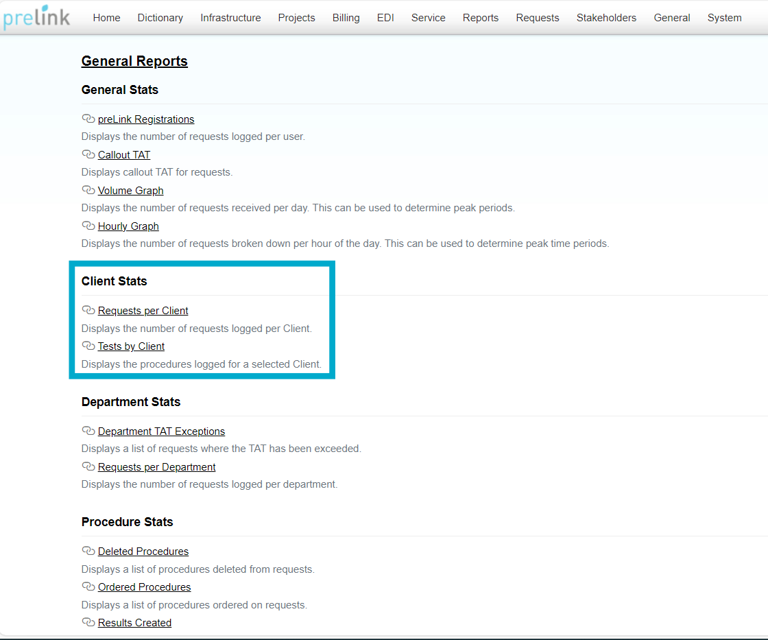 This report presents the volume and type of tests sent by a doctor/client over a selected time period.